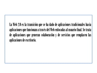 La Web 2.0 se refiere a la transición de aplicaciones tradicionales unidireccionales a aplicaciones enfocadas en el usuario, la colaboración y los servicios en línea. Abandona su enfoque unidireccional anterior para facilitar la máxima interacción entre usuarios y el desarrollo de redes sociales.