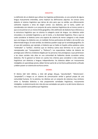 El documento define varios términos clave relacionados con el lenguaje. Define lenguaje como un sistema de comunicación desarrollado en los seres humanos. Distingue entre lengua, como el idioma o modelo general de una colectividad lingüística, e habla, como la materialización momentánea de ese modelo a través de la fonación y escritura. También define términos como dialecto, idioma, lingüística y semiología.