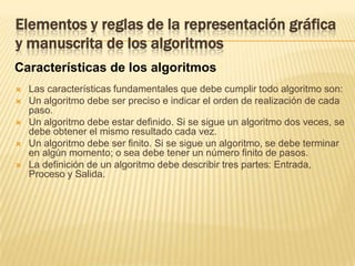 Las características fundamentales de un algoritmo son que debe ser preciso, definido y finito. Un algoritmo describe tres partes: entrada, proceso y salida. Los problemas complejos pueden resolverse dividiéndolos en subproblemas más simples mediante el método "divide y vencerás". Existen diferentes herramientas para representar algoritmos como diagramas de flujo, pseudocódigo y diagramas Nassi-Schneiderman.