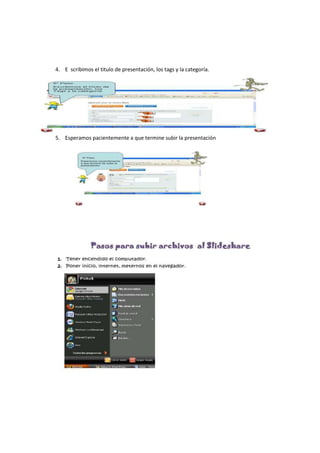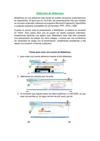 SlideShare es una aplicación web donde los usuarios pueden almacenar y compartir presentaciones de diapositivas. Las presentaciones deben crearse en programas como PowerPoint u OpenOffice y luego subirse a SlideShare, donde son convertidas a formato Flash para poder verse desde cualquier ordenador a través de una página web. Esto facilita compartir presentaciones de trabajo con colegas o dar conferencias en línea sin necesidad de llevar la presentación. Para crear una cuenta, los usuarios deben insertar un enlace, rellenar campos de información personal, subir archivos en format