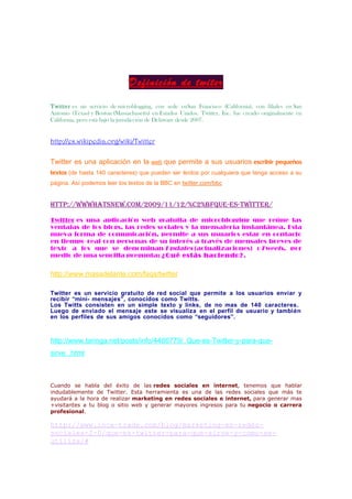Twitter es un servicio de microblogging gratuito que permite a los usuarios publicar y leer mensajes breves llamados tweets, con un máximo de 140 caracteres. Los usuarios pueden seguir a otros para ver sus tweets en tiempo real y construir una red social. Twitter se originó en San Francisco y ahora tiene oficinas en varias ciudades de Estados Unidos.