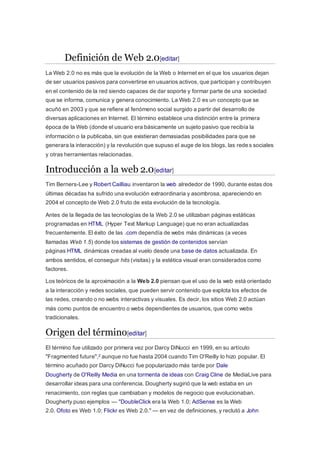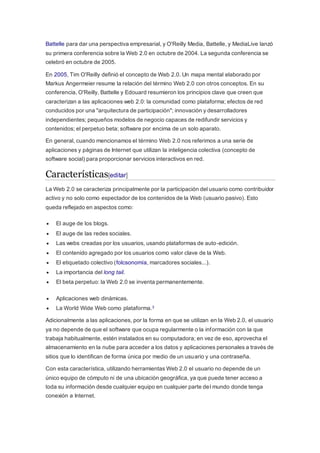 La Web 2.0 se refiere a la evolución de la Web, en la que los usuarios pasivos se convierten en usuarios activos que participan y contribuyen al contenido de la red. La Web 2.0 se caracteriza por la participación de los usuarios como contribuyentes activos a través de blogs, redes sociales, contenido generado por usuarios, etiquetado colectivo y aplicaciones web dinámicas. Las herramientas Web 2.0 también permiten a los usuarios acceder a datos e información desde cualquier dispositivo a través del almacenamiento en la nube