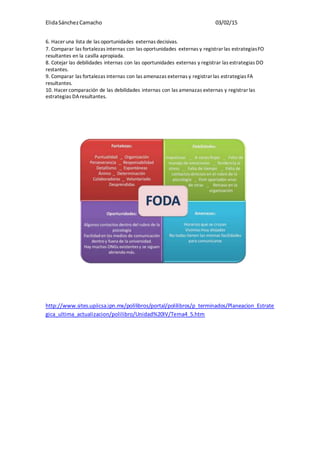 La matriz DOFA (Debilidades, Oportunidades, Fortalezas y Amenazas) es una herramienta de análisis utilizada para formular y evaluar estrategias analizando las debilidades y fortalezas internas de una entidad y las oportunidades y amenazas externas. El análisis DOFA identifica estrategias FO, DO, FA y DA para aprovechar fortalezas y oportunidades y reducir debilidades y amenazas. El proceso implica diagnosticar a la entidad, identificar sus factores internos y externos clave, y compar