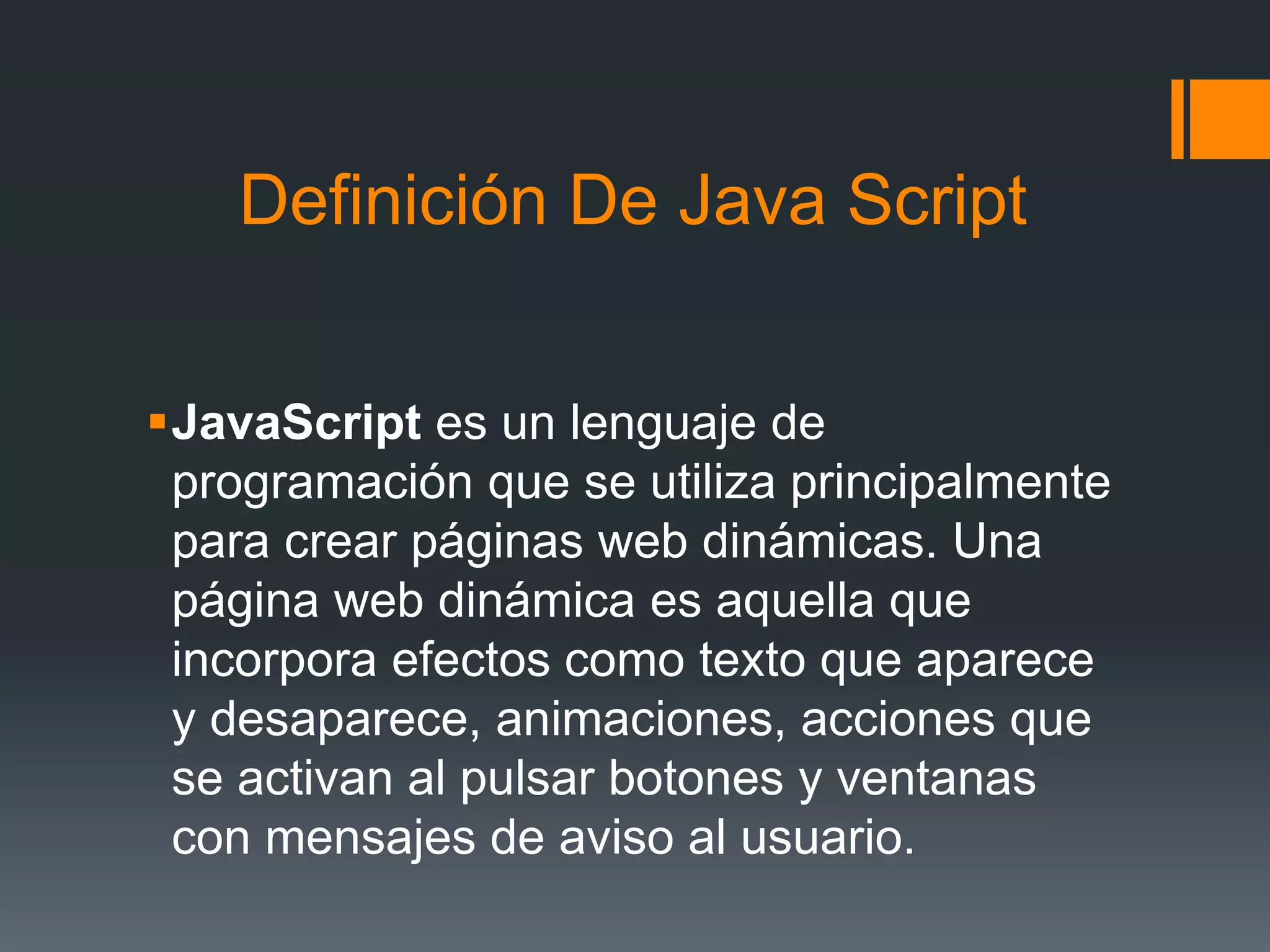 Este documento define JavaScript y describe su función. JavaScript fue creado originalmente por Brendan Eich en Netscape para mejorar las páginas web dinámicas. JavaScript es un lenguaje de programación interpretado que se utiliza principalmente en las páginas web para crear interactividad. Aunque comparte algunas similitudes con Java, JavaScript es fundamentalmente diferente y se enfoca más en eventos que en herencia.