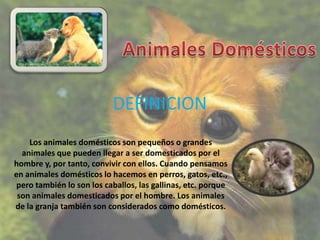 Los animales domésticos incluyen perros, gatos, caballos, gallinas y otros animales domesticados por los humanos. Los gatos son cazadores instintivos que capturan insectos y roedores, aunque a menudo no los consumen. Los perros son carnívoros domesticados relacionados con los lobos que ahora son alimentados como omnívoros. Las aves son vertebrados de sangre caliente que ponen huevos y los incuban, aunque no todas pueden volar.