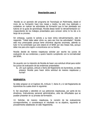 El documento describe dos casos de aprendices del SENA. En el primer caso, Federico necesita un carné para una visita a una empresa pero no ha recibido uno. En el segundo caso, Nicolás quiere recibir retroalimentación de su trabajo pero su tutor se niega a dársela. El documento pregunta cómo responder a cada aprendiz basado en el Reglamento de Aprendices del SENA.