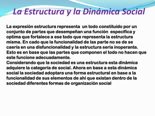 La sociedad es una forma organizada y jerárquica de convivencia humana que permite a sus miembros alcanzar un objetivo común. No está limitada por factores como la ubicación, intereses de grupo o características étnicas o religiosas. La sociedad tiene una estructura formada por partes interdependientes que cumplen funciones específicas para mantener el funcionamiento del todo. La dinámica social determina la forma estructural de la sociedad y las diferentes formas de organización social que existen dentro de ella.