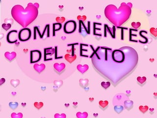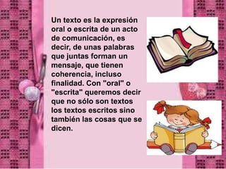 El documento define qué es un texto y sus características principales como la coherencia, cohesión y adecuación al destinatario. Luego describe diferentes tipos de textos como científicos, administrativos, jurídicos y periodísticos. Finalmente, explica los componentes básicos de un texto como la introducción, el cuerpo y la conclusión.