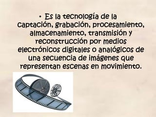 El video es la tecnología de capturar, grabar, procesar, almacenar, transmitir y reconstruir imágenes en movimiento de forma digital o analógica. Proporciona una base común de experiencias y tiene el poder de captar atención e interés a través de la imagen y el sonido. Además, hace que los conocimientos sean más inmediatos y reales. El tamaño de una imagen de video se mide en pixeles o líneas, y los formatos pueden ser analógicos o digitales, aunque aún se usan medios