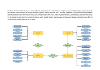 El documento presenta un segundo borrador del proyecto final sobre el registro de transacciones bancarias. Explica que el grupo decidió enfocarse en registrar retiros, depósitos, actualizaciones y descuentos de cuentas bancarias de clientes. Incluye un diagrama de entidad-relación que muestra las entidades de cliente, cuenta, transacción y cajero, y las relaciones entre ellas.