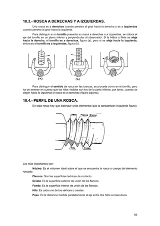 Este documento define y clasifica los diferentes tipos de roscas. Define una rosca como un prisma helicoidal enrollado en el exterior o interior de una superficie cilíndrica. Las clasifica según la forma del prisma en triangular, cuadrada, trapecial, redonda o en diente de sierra. Explica las diferencias entre rosca a derechas e izquierdas y describe los elementos que caracterizan el perfil de una rosca como el núcleo, flancos, crestas y fondo.