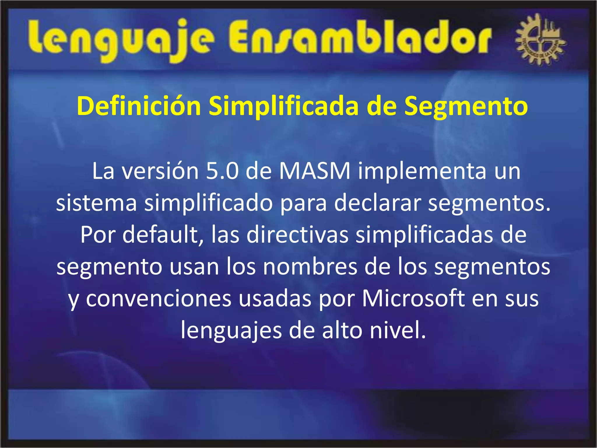 Este documento describe los segmentos de memoria y sus directivas en ensamblador MASM. Explica los diferentes modelos de memoria como Tiny, Small, Medium, etc. y cómo declararlos usando .MODEL. También cubre las directivas simplificadas para declarar segmentos como .CODE, .DATA, .STACK, y el orden en que se colocan los segmentos.