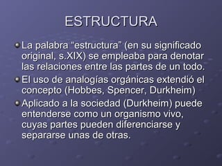 La estructura social se refiere al conjunto de probabilidades que tienen los individuos de una población determinada de ser ubicados en las diferentes categorías sociales resultantes de la división social del trabajo, como las clases sociales. La estructura también implica las instituciones que organizan la vida social a través de los principios reguladores que guían las actividades de los individuos en una sociedad.