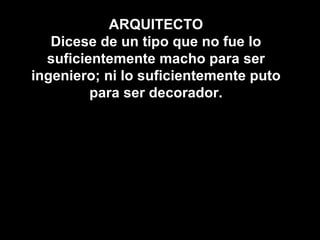 El documento contiene definiciones irónicas y humorísticas de varios términos y profesiones, que critican estereotipos de género y roles sociales. Se describen profesiones como arquitecto, urologo y ginecólogo de una manera satírica. También incluye definiciones irónicas de conceptos como amor, busto, facilidad y confianza que cuestionan actitudes sobre sexualidad y relaciones de poder. El documento utiliza el humor para examinar y criticar estereotipos.