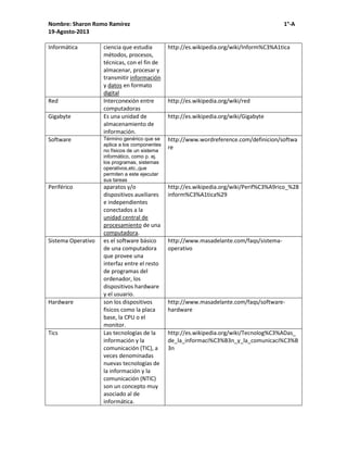 Este documento define varios términos relacionados con la informática y la tecnología. Define conceptos como aplicación, Internet, memoria RAM, multimedia, microprocesador, comunicación, megabyte, pc, informática, red, gigabyte, software, periférico, sistema operativo, hardware, tics, tecnología, dato, archivo, información, memoria ROM, byte, kilobyte y virus. Cada definición incluye una breve explicación del término y la fuente de donde proviene la definición.