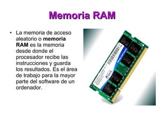 El documento define cuatro términos clave relacionados con los componentes de un ordenador: la memoria RAM, que almacena temporalmente datos e instrucciones para el procesador; la memoria ROM, que almacena datos de forma permanente pero no modificable; el chipset, que controla la interacción entre el procesador y otros componentes; y el bus, que transfiere datos entre los componentes a través de cables o circuitos.