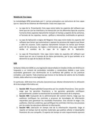 Este documento presenta definiciones y descripciones de varios conceptos y estándares relacionados con sistemas de información empresarial. Explica el modelo de tres capas típico de estos sistemas y describe conceptos como SOX, ITIL, COBIT, Basilea y ISO, enfocándose en sus objetivos, secciones clave y riesgos relevantes.