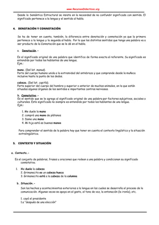 El documento habla sobre el significado de la palabra, su estructura y diferentes componentes semánticos como significado, sentido, denotación, connotación, contexto y situación. Explica que la palabra está constituida por un significante y significado relacionado a la realidad cultural. Distingue entre significado que pertenece a la lengua y sentido que pertenece al habla. También diferencia denotación que identifica el referente de la palabra vs connotación que agrega significados subjetivos.