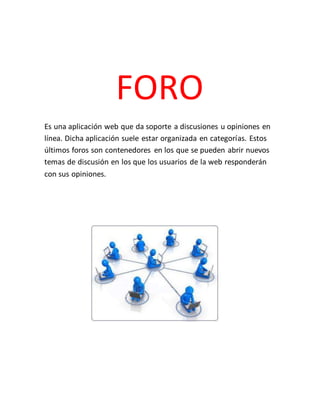 El documento define y describe varios métodos de comunicación digital como el chat, foros, correo electrónico, wikis y blogs. El chat permite conversaciones simultáneas entre dos o más personas conectadas a internet, los foros son sitios para discusiones y opiniones organizadas por categorías, el correo electrónico permite comunicación entre usuarios a través de mensajes enviados y recibidos por computadora, las wikis son sitios donde cualquier persona puede editar contenido de forma rápida, y los blogs son sitios donde un autor publica contenidos de su interés actualizados frecu