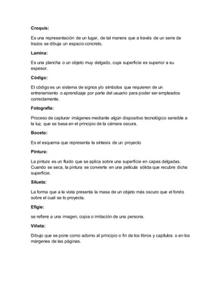 Este documento define varios tipos de representaciones visuales como el dibujo, la caricatura, el símbolo, el icono, el esquema, la figura, el retrato, el diseño, la ilustración, el croquis, la lámina, el código, la fotografía, el boceto, la pintura, la silueta, la efigie, la viñeta, el signo, la estampa y la gráfica.
