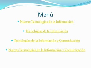 El documento define y compara las Nuevas Tecnologías de la Información (NTI), Tecnologías de la Información (TI), Tecnologías de la Información y Comunicación (TIC) y Nuevas Tecnologías de la Información y Comunicación (NTIC). Las NTI se refieren a elementos como hipertextos, multimedia e Internet. Las TI se refieren al almacenamiento y procesamiento de información usando cualquier tecnología. Las TIC son herramientas de comunicación previas a Internet. Y las NTIC son procesos y productos