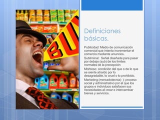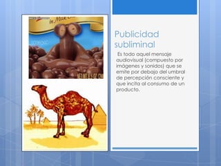 El documento trata sobre la publicidad subliminal. Explica que es un mensaje oculto que se emite debajo del umbral de percepción consciente para incitar el consumo de un producto. Analiza estudios que muestran que los mensajes subliminales pueden influir en las preferencias de las personas. También describe cómo empresas como Coca Cola han utilizado esta técnica para posicionarse como marcas líderes a nivel mundial.