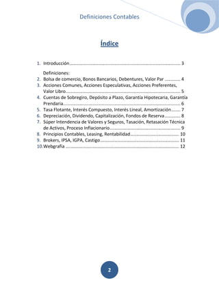 El documento provee definiciones de varios términos contables e incluye un índice y una breve introducción. Define términos como bolsa de comercio, bonos bancarios, debentures, valor par, acciones comunes, acciones especulativas, acciones preferentes, valor libro, cuentas de sobregiro, depósito a plazo, garantía hipotecaria, garantía prendaria, tasa flotante, interés compuesto, interés lineal, amortización, depreciación, dividendo, capitalización, fondos de reserv