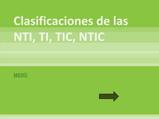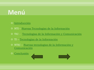Este documento define y explica brevemente varios términos relacionados con las tecnologías de la información y la comunicación. Define NTI, TIC, TI y NTIC, y explica que estas tecnologías han evolucionado rápidamente, mejorando la comunicación y la vida de las personas. También describe cómo estas tecnologías pueden integrarse para crear sistemas de información interconectados y cómo influyen en la sociedad, como en el gobierno electrónico.
