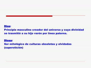 El documento contiene definiciones estereotipadas y sexistas de varios términos relacionados con género, que atribuyen características negativas a las mujeres y positivas a los hombres. Además, incluye un pensamiento filosófico que sugiere que cuanto más alto es el cargo de una persona, menor es su capacidad de compromiso.