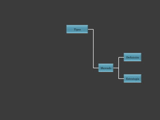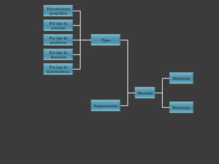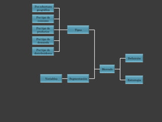 El documento define el mercado meta como el segmento de mercado que la empresa decide captar para obtener beneficios. Se requieren tres condiciones para hablar de un mercado: necesidad, intención de compra y capacidad económica. También describe las estrategias de mercado como procesos que permiten a las empresas ser proactivas y definir su futuro, y los tipos de mercado como local, regional, nacional e internacional.
