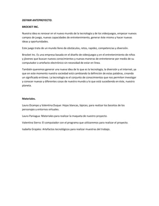 Brocket Inc. es una empresa de diseño de videojuegos que quiere crear un nuevo juego lleno de obstáculos, retos y diversión para entretener a niños y jóvenes. También busca renovar el concepto de tecnología y entretenimiento al tiempo que genera nuevas ideas. El equipo utilizará lápices, hojas, una maqueta y programas de computación para desarrollar el juego y mostrar su progreso.