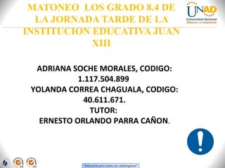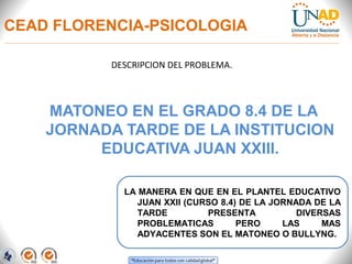 Este documento describe un proyecto para prevenir el matoneo y el embarazo prematuro en estudiantes de grado 8.4 en una escuela en Florencia, Caquetá. El proyecto tiene como objetivo general crear una campaña para generar conciencia sobre esta problemática a través de diversas actividades como talleres, charlas, dramatizaciones y dinámicas de grupo durante el año escolar.