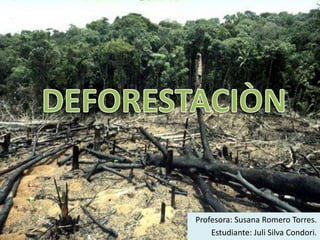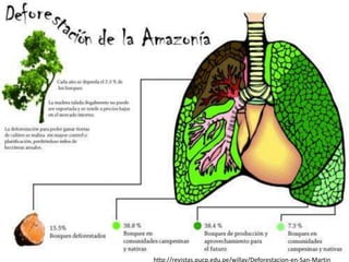 La deforestación es un grave problema en la región de San Martín, Perú. La provincia de San Martín es la más afectada por la deforestación en el país, con solo 215,222 hectáreas de bosque remanente de un total de 5'163,858 hectáreas. La tala ilegal y la conversión de tierras forestales a uso agrícola y ganadero son las principales causas de la pérdida de bosques en la región. La riqueza forestal del Perú se concentra principalmente en la Amazonía, aunque la tala también ocurre en otras region