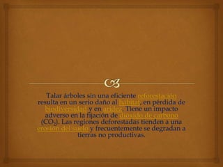 La deforestación es causada principalmente por la tala de árboles para la industria maderera, agricultura, minería y ganadería llevada a cabo por el hombre, lo que resulta en daños al hábitat y pérdida de biodiversidad. Factores como el descuido del valor de los bosques, la falta de valor atribuido a ellos, el manejo irresponsable de la forestación y las leyes ambientales deficientes conducen a la deforestación a gran escala, la cual causa extinción de especies, cambios climáticos, desert