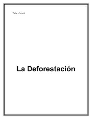 Este documento aborda la deforestación, sus causas y consecuencias, destacando su impacto en el medio ambiente, la biodiversidad y el clima. Se plantea la necesidad de reforestación y conciencia ambiental para mitigar el problema, haciendo énfasis en la responsabilidad de las nuevas generaciones. Se sugieren estrategias como la creación de parques ecológicos y la educación comunitaria para promover la sostenibilidad.