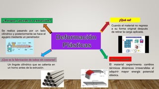 El documento define la deformación plástica como cuando un material no regresa a su forma original después de retirar la carga aplicada, experimentando cambios térmicos dinámicos irreversibles al adquirir mayor energía potencial elástica. Describe el proceso de fabricación de tubos sin costuras calentando primero un lingote cilíndrico en un horno y luego extruyéndolo a través de un lado cilíndrico para formar un agujero mediante un penetrador.
