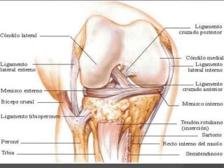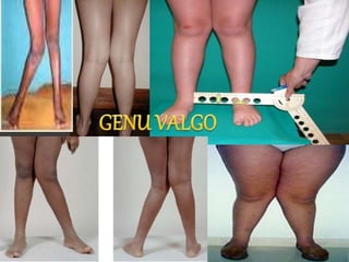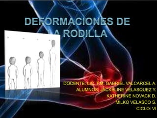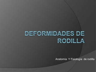 Este documento presenta información sobre la anatomía y fisiología de la rodilla. Resume las estructuras óseas, ligamentos, meniscos y músculos que componen la rodilla, así como sus movimientos de flexión, extensión y rotación. También describe deformaciones comunes como el genu valgum, genu varum y genu recurvatum, sus causas, evaluación, tratamiento conservador y quirúrgico.