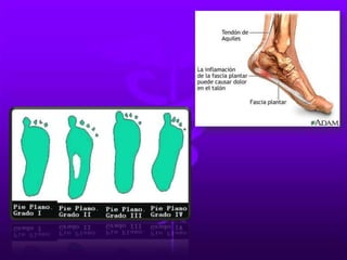 Este documento describe dos tipos comunes de deformidades del pie: pie plano y pie cavo. Explica que el pie plano ocurre cuando se pierde el arco natural del pie, causando que la planta del pie apoye completamente en el suelo. El pie cavo es la deformidad opuesta, con un arco del pie más pronunciado. También discute las causas, síntomas y tratamientos de ambas condiciones.