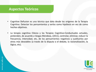 La defusión cognitiva es una técnica de la terapia cognitiva que consiste en ver los pensamientos como hipótesis en lugar de hechos objetivos. Se trata de socavar la función reguladora del comportamiento de los eventos internos verbales y su impacto literal, ayudando a los clientes a distanciarse del significado literal de sus pensamientos y considerarlos como un proceso. Las técnicas de defusión cognitiva incluyen objetivizar pensamientos y emociones a través de metáforas y ejercicios con el lenguaje.