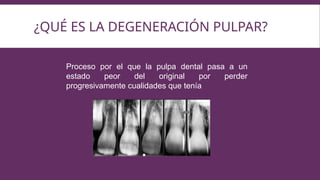 La degeneración pulpar es el proceso en el cual la pulpa dental pierde cualidades, afectando principalmente a personas mayores o jóvenes por irritación persistente, y no siempre está relacionada con caries. Incluye la formación de nódulos y agujas pulpares que no provocan inflamación, así como degeneraciones fibrosa y grasa. Este proceso puede resultar en atrofia pulpar y reabsorción interna, notándose a través de cambios clínicos y radiográficos.