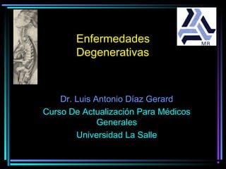 Este documento describe varias enfermedades degenerativas como la enfermedad de Alzheimer y la enfermedad de Parkinson. La enfermedad de Alzheimer se caracteriza por la pérdida neuronal progresiva y demencia. La enfermedad de Parkinson implica la degeneración del sistema nigroestriado dopaminérgico y causa temblores, rigidez y otros síntomas. El documento también cubre otros trastornos de demencia y el síndrome de Hakim-Adams.