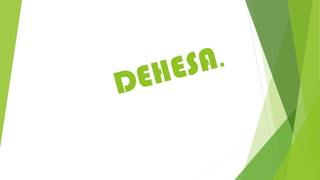 Este documento describe los componentes de un ecosistema de dehesa típico de la península ibérica. Explica que las dehesas son ecosistemas creados por el ser humano a partir de bosques de encinas y tienen un clima árido con suelos pobres. Detalla las cadenas tróficas presentes, incluyendo productores como la alfalfa, consumidores como el conejo europeo y el buho real, y descomponedores como las bacterias. También resume las relaciones interespecíficas comunes como la simbios