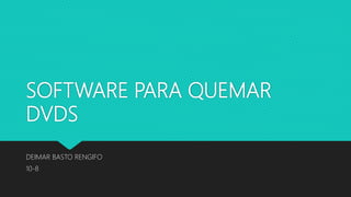 El documento presenta varios programas de software para grabar DVDs, incluyendo InfraRecorder, BurnAware, Nero y Burn4Free DVD Burning, destacando sus compatibilidades y funcionalidades. InfraRecorder permite la grabación de varios tipos de medios y es compatible con versiones de Windows desde 2000 hasta Vista. BurnAware y Nero también ofrecen opciones avanzadas de grabación, mientras que Burn4Free se caracteriza por su facilidad de uso y amplia compatibilidad con distintos formatos de disco.