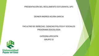 Este documento presenta el reglamento estudiantil de la Universidad Popular del Cesar. Explica que el reglamento establece las normas, derechos, deberes y garantías que rigen el comportamiento de los estudiantes dentro y fuera de la universidad. Describe algunas definiciones de reglamento estudiantil y explica que este conjunto de normas regula el comportamiento individual y académico de los estudiantes. Finalmente, destaca que el reglamento es útil para que los estudiantes hagan valer sus derechos y conocer sus deberes.
