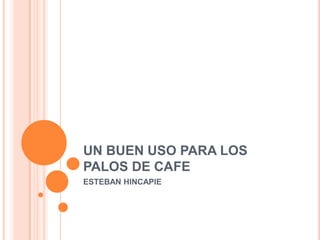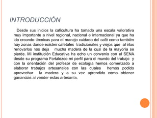 El documento describe cómo los palos de café después del soqueo pueden usarse para hacer muebles y artesanías, lo que proporciona una fuente de ingresos para los campesinos. Explica el proceso de limpieza, corte y ensamblaje de los palos y describe algunos productos como mesas, sillas y camas. El objetivo es aprovechar la madera desechada y generar ganancias a través de la venta de estas artesanías.