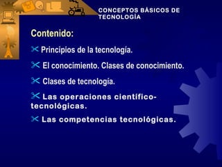 Este documento presenta conceptos básicos de tecnología. Explica que la tecnología es conocimiento que permite transformar la naturaleza. Identifica tres tipos de conocimiento: ciencia, técnica y tecnología. También clasifica la tecnología en incorporada y desincorporada, e identifica operaciones científico-tecnológicas y competencias tecnológicas. El objetivo es explicar estos conceptos clave sobre la naturaleza y alcance de la tecnología.