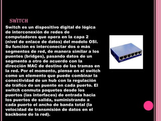 Este documento describe cuatro tipos de equipos de red activos: switch, modem, router y punto de acceso. Un switch opera en la capa 2 y conecta segmentos de red pasando datos según la dirección MAC. Un modem modula y demodula señales para transmitirlas a larga distancia. Un router proporciona conectividad a nivel de red interconectando subredes con prefijos IP diferentes. Un punto de acceso inalámbrico interconecta dispositivos alámbricos y forma una red inalámbrica que puede conectarse a una red cableada