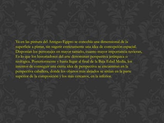 La perspectiva es el arte de representar la profundidad y posición relativa de objetos en un dibujo mediante técnicas como hacerlos más pequeños cuanto más lejanos están y hacer converger las líneas paralelas hacia un punto de fuga. Miguel Ángel usó la perspectiva en la Plaza del Campidoglio en Roma. A través de la historia, la perspectiva evolucionó de una jerárquica en el Antiguo Egipto a una caballera en la Edad Media hasta el descubrimiento de la perspectiva cónica en el Renac