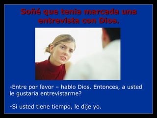 En un sueño, el narrador tiene una entrevista con Dios. Dios expresa su sorpresa por cómo la humanidad desea crecer rápido pero luego desea ser niños, malgasta la salud por dinero y luego gasta dinero por salud, y vive ansiosamente por el futuro olvidando el presente. Cuando se le pregunta sobre las lecciones para la humanidad, Dios responde que deben aprender a dejarse amar, que lo valioso son las personas y no las posesiones, a no compararse, a perdonar y a ser felices.