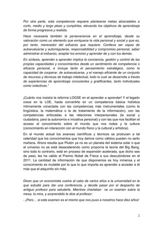 La competencia para aprender a aprender implica la capacidad de iniciar el aprendizaje de manera autónoma en diferentes contextos y mantenerlo a lo largo de la vida mediante la integración de conocimientos, habilidades y actitudes. Requiere tomar conciencia de las propias capacidades y limitaciones, utilizar estrategias de aprendizaje efectivas, establecer metas y autoevaluarse para mejorar de forma continua.